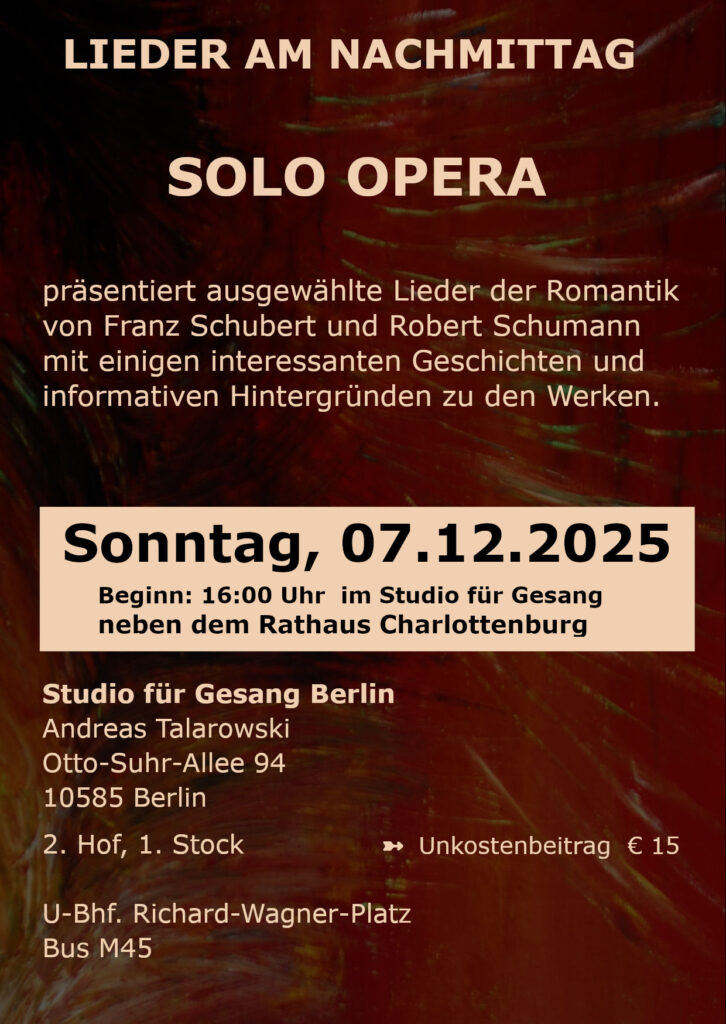 Solo Opera präsentiert ausgewählte Lieder der Romantik von Franz Schubert und Robert Schumann. Dazu werden interessante Geschichten und informative Hintergründe zu den Liedern erzählt.