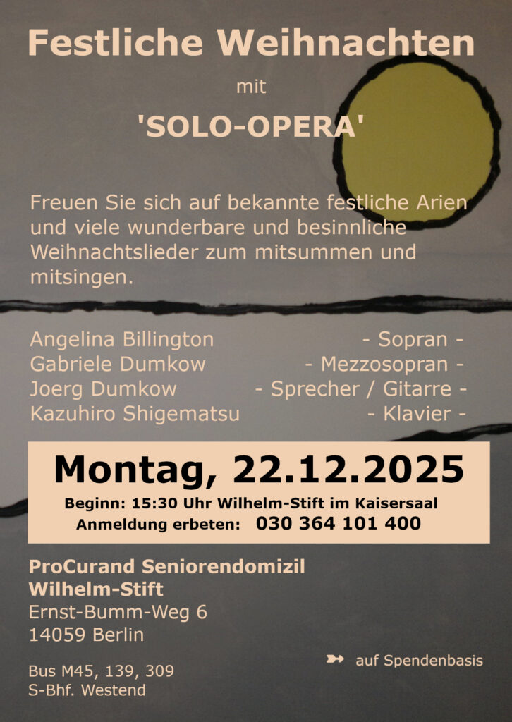 Solo Opera präsentiert ein kurzweiliges Weihnachtsprogramm mit bekannten festlichen Arien und vielen wunderbaren und besinnlichen Weihnachtsliedern zum mitsummen und mitsingen.